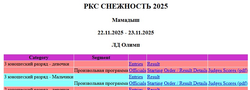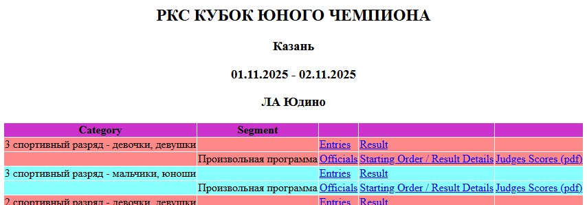 Опубликованы Протоколы соревнований «Кубок Виража» (1 этап) по фигурному катанию на коньках. Соревнования прошли в ЛА «Юдино» г.Казани с 25 по 26 октября 2025 г.