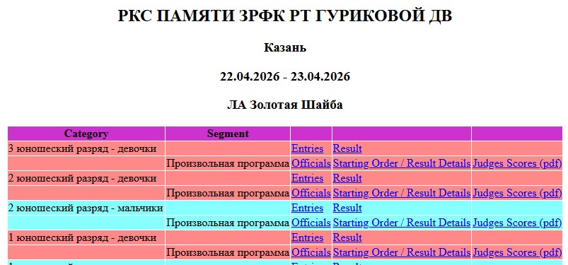 Опубликован протокол Республиканских классификационных соревнований «Кубок Федерации РТ» по фигурному катанию на коньках. Соревнования прошли с 13 по 15 апреля во Дворце спорта г.Казани. Протокол Республиканских классификационных соревнований «Кубок Федерации РТ» по фигурному катанию на коньках Кубок Федерации РТ