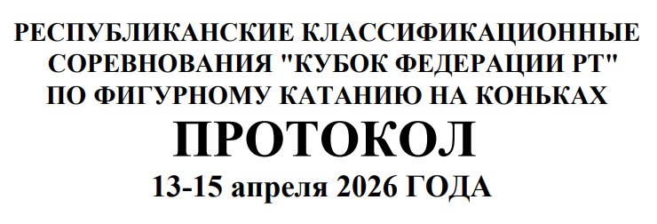 Опубликован протокол Республиканских классификационных соревнований «Кубок Федерации РТ» по фигурному катанию на коньках. Соревнования прошли с 13 по 15 апреля во Дворце спорта г.Казани. Протокол Республиканских классификационных соревнований «Кубок Федерации РТ» по фигурному катанию на коньках Кубок Федерации РТ