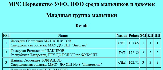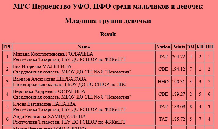 В младшей группе девочек 1 место заняла Милана ГОРБАЧЕВА (ГБУ ДО РСШОР по ФККиШТ), 5 место заняла Илона ПАНАЕВА (ГБУ ДО РСШОР по ФККиШТ) и 6 место Аида ХАМИДУЛЛИНА (ГБУ ДО РСШОР по ФККиШТ).
