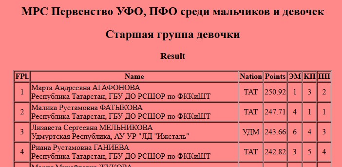В старшей группе девочек 1 место заняла Марта АГАФОНОВА (ГБУ ДО РСШОР по ФККиШТ), 2 место заняла Малика ФАТЫКОВА (ГБУ ДО РСШОР по ФККиШТ), 4 место Риана ГАНИЕВА (ГБУ ДО РСШОР по ФККиШТ).